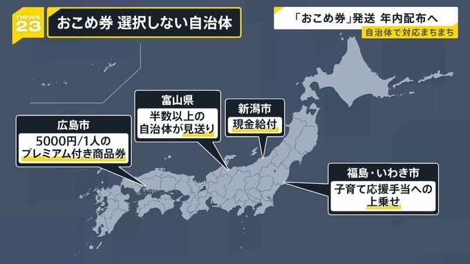 広島市は1人当たり5000円分のプレミアムがついた商品券を検討しているほか、富山県は半数以上の自治体が「おこめ券」は見送る方針。福島県いわき市は「おこめ券」ではなく子育て応援手当への上乗せなどに交付金を充てる考えを示しています。