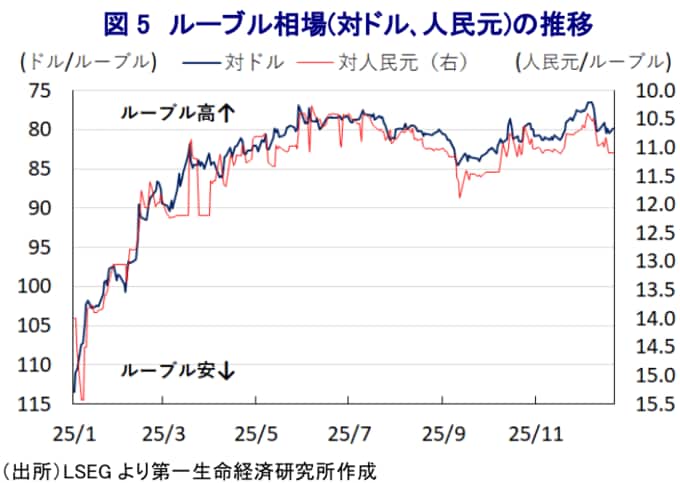 金融市場においては、ウクライナ戦争の終結に向けてトランプ米大統領が介入の動きを積極化させていることも追い風に、早期に終結に向かうとの期待を反映して通貨ルーブル相場は底堅い動きをみせてきた。