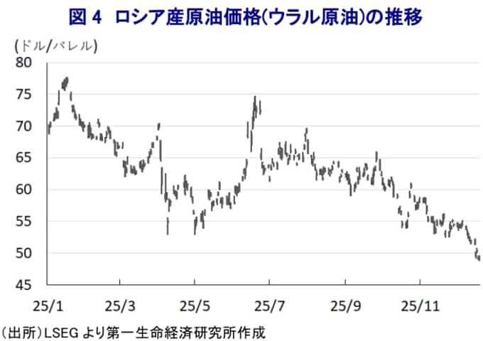 こうしたなか、ロシア政府の要望に沿う形で、石油輸出国の枠組みであるOPECプラスを通じて来年1~3月の増産停止で合意したものの、その後も原油価格は低迷が続いて財政均衡水準(ウラル原油で1バレル=56ドル(当初は69.7ドル))を大きく下回っている。