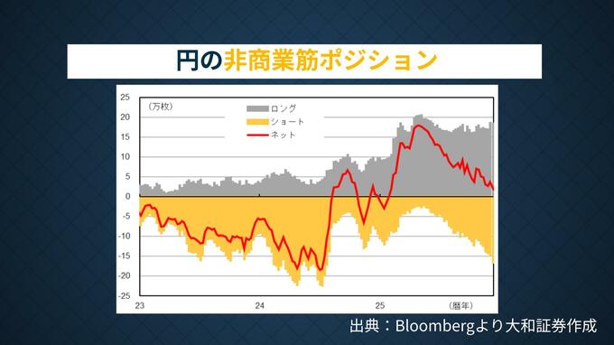 「非商業筋のネットポジションを見ると、全体としては円を買う状態からやや売り方向に動いてきているので円安圧力になっていることは確か。ただ、面白いのは円のロングポジション(買い)が減っていないこと」と指摘。