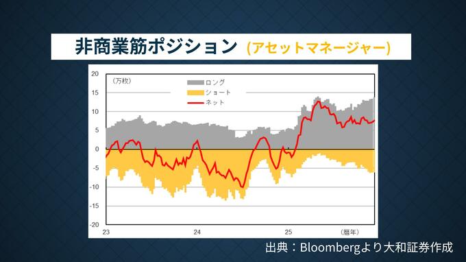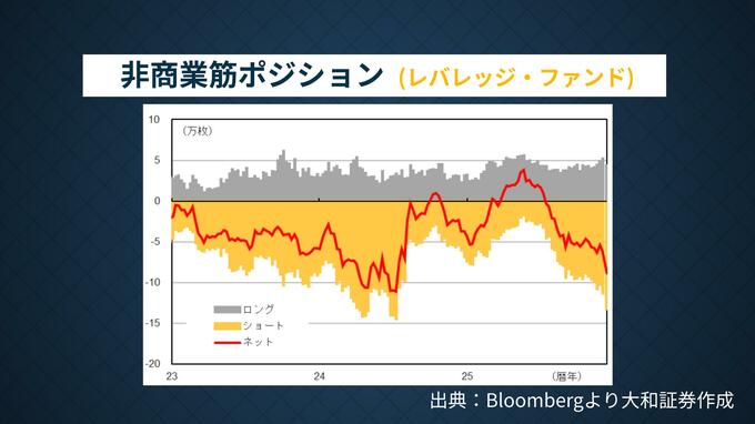 投資家のタイプ別に見ると、「アセットマネージャー(長期投資家)はロングポジションを維持している一方、レバレッジファンド(短期投機筋)はショートポジション(売り)を積み上げている」と説明。「両サイドの見方が混在している状況」だと分析しました。
