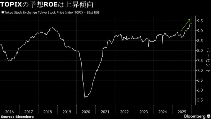 ブルームバーグ・インテリジェンスのデータによると、来年の日本企業の利益は7.4%増加する見込み。また企業はガバナンス(統治)改革により資本効率の改善や現預金の効率活用、株主還元の拡充を進めており、それがROEの向上につながっている。