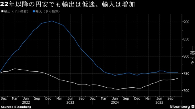 円安は輸出を促進すると一般的には理解されているが、実態を見ると2022年以降の円安局面でも輸出は伸び悩み、ドル建てでは縮小している。このため貿易収支は赤字傾向が続き、輸出面のメリットよりも輸入コスト増加のデメリットが上回る状況だ。円安が購買力の低下につながり、賃金の上昇にもかかわらず国内消費が低迷している要因の一つともなっている。