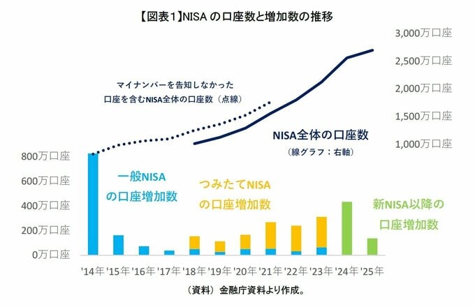 NISAの口座数は、2025年5月末時点で2,696万に達している。