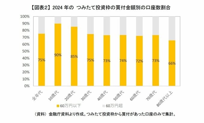 だが、2024年のつみたて投資枠の買付実績を見ると、現役世代の7割強が年間60万円以下の利用にとどまっている。