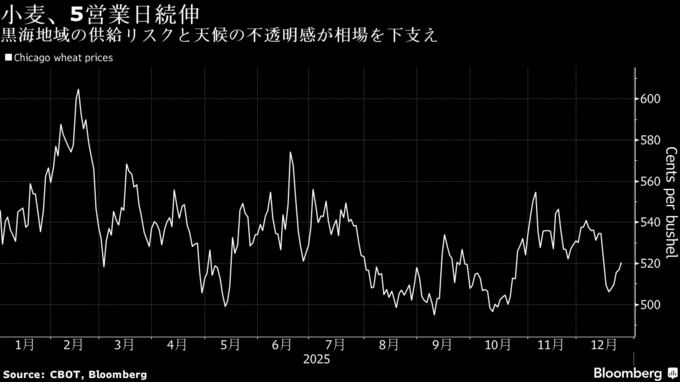 (ブルームバーグ):シカゴの小麦先物相場は24日の取引で5営業日続伸。4月以来最長の上昇となる見通しだ。黒海地域からの供給リスクや天候を巡る不透明感が相場を支えている。