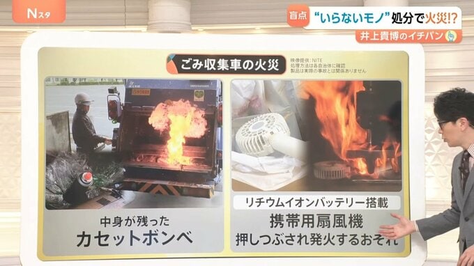 リチウムイオンバッテリーが搭載されている扇風機もごみ収集車に押しつぶされ発火するおそれがあるため適切な処理をすること。