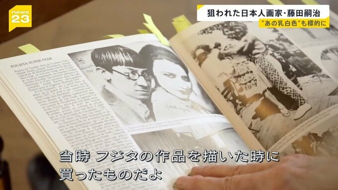 「これは君たちのために探しておいたんだ。当時、フジタの作品を描いた時に買ったものだよ。私は、モンパルナスで活動していた画家のほとんどの絵を描いたんだ。フジタもその1人だったよ」