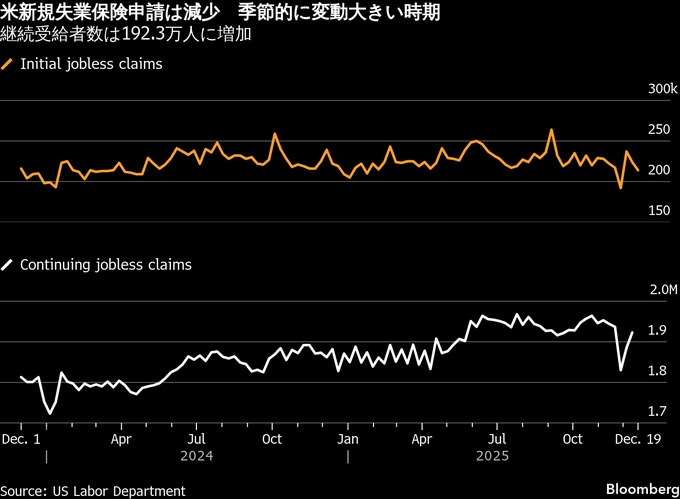 ブルームバーグ・エコノミクスのイライザ・ウィンガー氏は新規失業保険申請件数について、「引き続きレイオフが限定的なことを示唆している。しかし12月に入って、雇用環境に対する消費者の見方がやや悪化しており、それは継続受給者数の高止まりと整合的だ」と指摘。