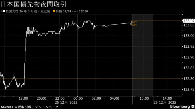 先物夜間取引で3月物は24日の日中取引終値比27銭高の133円07銭で終了した。24日の米10年債利回りは前日比3ベーシスポイント(bp、1bp=0.01%)低い4.13%程度で引けた。