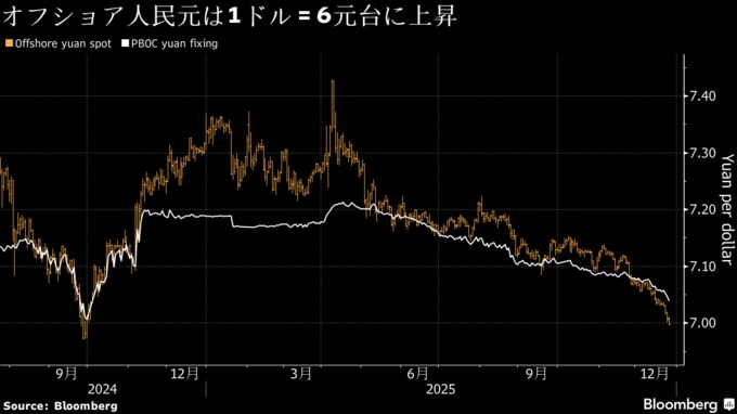 (ブルームバーグ):中国のオフショア人民元は25日、1ドル=6元台に上昇した。心理的な節目の7元突破は2024年9月以来。オフショア人民元は一時、対ドルで0.2%高の6.9964元となった。