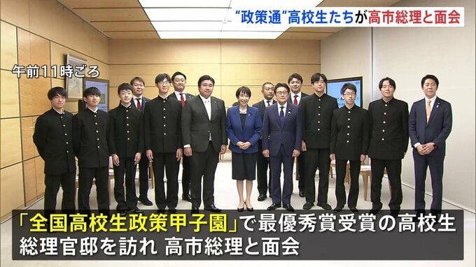 高市総理はきょう、全国の高校生による政策コンテストの最優秀賞の受賞者と面会し、「新しい視点で参考になる」などと感想を述べました。政策コンテスト「全国高校生政策甲子園」で最優秀賞を受賞した高校生がきょ…