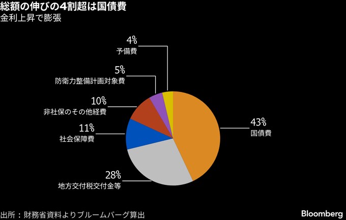 利払い費算出の前提となる積算金利は、金利の上昇を踏まえて今年度の2.0%から3.0%に引き上げた。日銀の利上げや財政悪化懸念を背景に、長期金利は22日に一時2.1%と1999年2月以来の水準に達した。「金利のある世界」の到来で今後も多額の国債費の計上を迫られれば、積極財政の裁量が一段と狭まることになる。