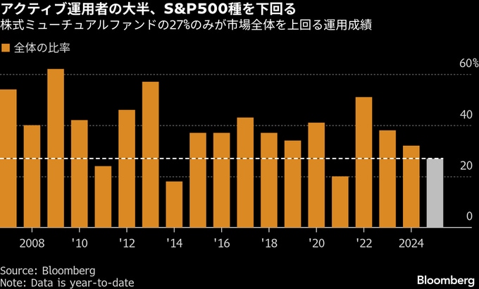 BIのアタナシオス・プサロファギス氏によると、米国では2025年、株式ミューチュアルファンドの73%が、運用成績でベンチマークを下回った。これは07年にさかのぼるデータで4番目に高い水準。