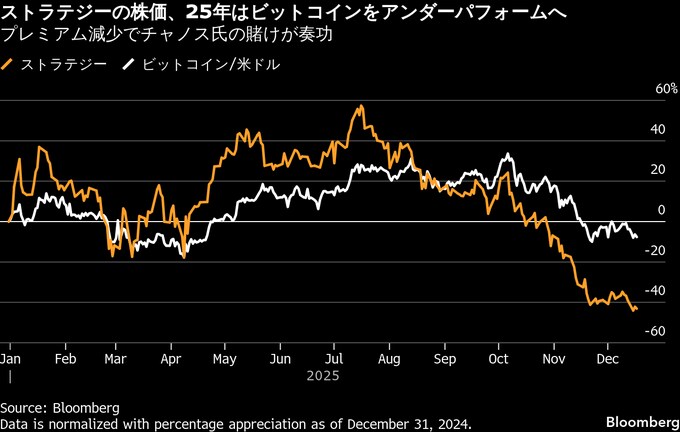 2025年初め、ビットコインが急騰し、ストラテジー株も急伸する中で、チャノス氏はチャンスを見いだす。ストラテジーの株価が、保有するビットコインの評価額を上回って取引されていることを「持続不可能」と見て、5月にストラテジー株の空売りとビットコインの買い持ちを公表した。