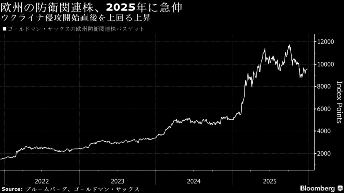 ゴーグルメーカーから化学メーカー、印刷会社に至るまで防衛関連株は猛烈な勢いで買われた。欧州防衛株で構成されるブルームバーグの指数は23日時点で年初来70%超上昇している。