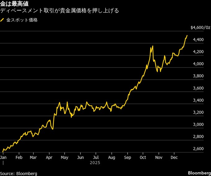 米財政見通しを巡る懸念が過去最長の政府閉鎖と重なった10月にこれが最高潮に達した。投資家はドル以外に避難先を求め、金とビットコインはいずれも最高値を更新。これはライバル視されることが多い両資産にとっては珍しい局面だった。