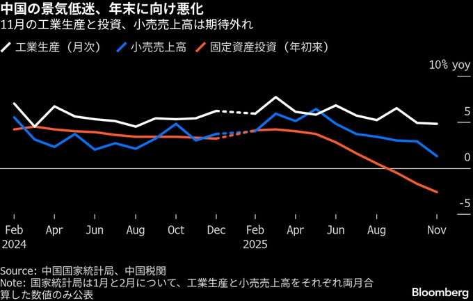 だが、その勢いは鈍りつつある。年間投資が1998年以来の減少に転じる見通しで、11月の小売売上高は新型コロナ期を除き最悪の伸びに落ち込み、新築住宅価格は11月にさらに下落した。終わりの見えない不動産危機が重しとなっている。