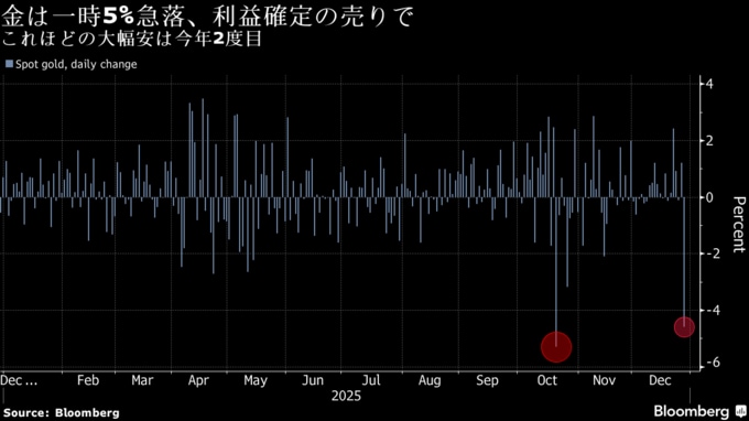 (ブルームバーグ):米ニューヨーク時間29日の取引で、金と銀がそろって急落。足元の大幅な値上がりを受けて利益確定の売りが優勢となっている。年末で市場の流動性が低く、値動きが増幅されている面もある。