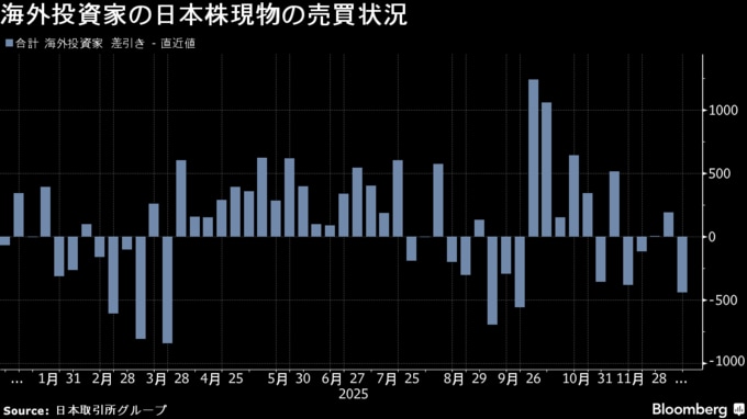 日本取引所グループのデータによると、外国人投資家は25年に日本株を5兆4000億円買い越しており、買越額はアベノミクス相場初期の13年以来の大きさに膨らんでいる。