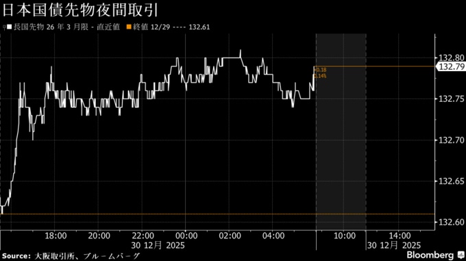 先物夜間取引で3月物は29日の日中取引終値比18銭高の132円79銭で終了した。29日の米10年債利回りは前週末比2ベーシスポイント(bp、1bp=0.01%)低い4.11%程度で引けた。
