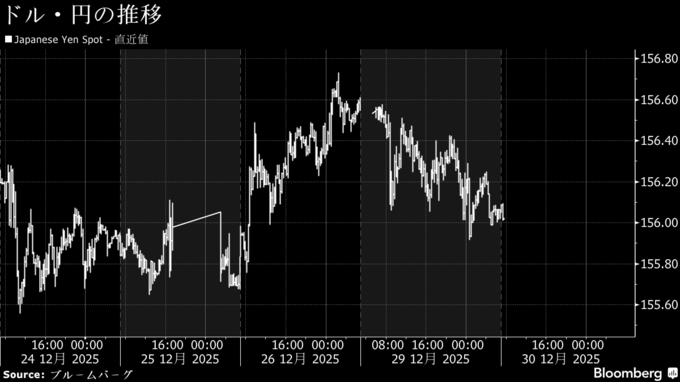 (ブルームバーグ):30日朝の外国為替市場で、円は対ドルで156円前後と前日からほぼ横ばいで推移している。日本銀行の追加利上げ期待と財政拡大への懸念が交錯する中、東京市場は年内最後の取引で薄商いとなり、相場は上下に振れやすい状況だ。