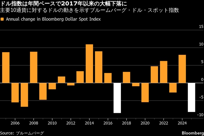 主要10通貨に対するドルの動きを示すブルームバーグ・ドル・スポット指数は、0.1%未満上昇。アジアおよび欧州時間の下げから反転した。年間ベースでは約8%下げており、2017年以来の大幅安に向かっている。