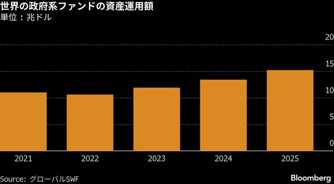 (ブルームバーグ):世界の政府系ファンドの資産運用残高が過去最高の15兆ドル(約2350兆円)に達した。グローバルSWFの最新のリポートで明らかになった。多くのファンドがテクノロジー分野への投資を強化し、相場の活況で利益を上げた。