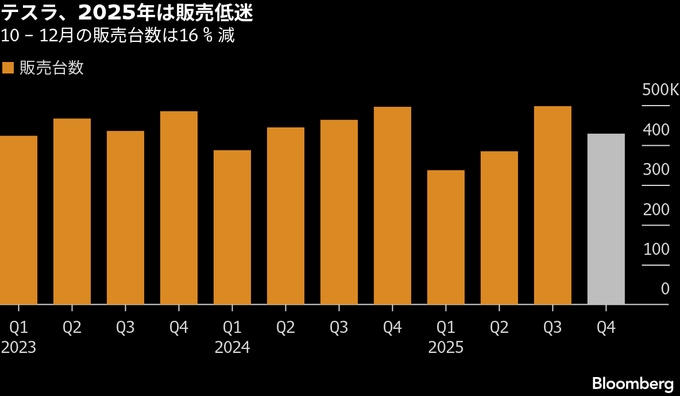 テスラの2日発表によると、10-12月(第4四半期)の販売台数は16%減の41万8227台となり、ブルームバーグと同社が集計したアナリスト予想を下回った。