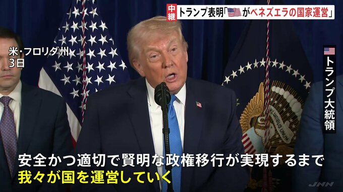 トランプ大統領は当面、アメリカがベネズエラの国家運営を行うと表明しました。ワシントン支局から中継です。トランプ大統領はベネズエラでの政権移行が実現するまで「アメリカが国を運営する」と表明しましたが、…