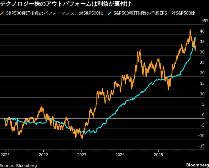 これに対し、AIにけん引された今回の株高局面は3年目に入っており、S&P500種は2022年末以降で79%上昇、ハイテク株比率の高いナスダック100指数は130%上昇している。