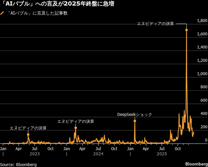 株式バブルの可能性を巡る議論は2025年を通じてくすぶっていたが、著名投資家のマイケル・バーリ氏やイングランド銀行(英中銀)からの警告を受け、11月と12月にかけて熱を帯びた。ブルームバーグがまとめたデータによると、11月に「AIバブル」という表現に言及した記事は1万2000本超に上り、それ以前の10カ月分の合計とほぼ同水準だった。