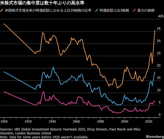一方で、金融市場の歴史に詳しい専門家は、この集中度が近年の水準と比べて極端に見えるとしても、前例はあると指摘する。過去125年にわたる世界の資産リターンを研究したロンドン・ビジネス・スクールのポール・マーシュ教授によると、米国市場に占める上位銘柄の比率は、1930年代や1960年代にも同様に高水準にあった。1900年には米国市場の時価総額の63%が鉄道株に結び付いていた一方、2024年末時点でテクノロジー株が占める割合は37%だったと、マーシュ氏は指摘した。