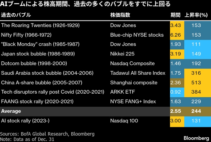 AI主導のテック株上昇が行き過ぎ、あるいはペースが急激過ぎるかを見極める簡単な方法の一つは、過去の強気相場と比較することだ。バンク・オブ・アメリカ(BofA)のストラテジスト、マイケル・ハートネット氏の分析によると、1900年以降に世界で発生した10の株式バブルは、平均して2年半強続き、底値から天井までの上昇率は244%だった。