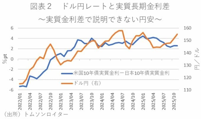 というのも、そもそも円安のきっかけが、日本のインフレ率高止まりに伴う日本の実質金利大幅マイナスに加え、高市政権誕生に伴う金融・財政政策に対するハト派姿勢観測が追い打ちをかけているとする向きもある。
