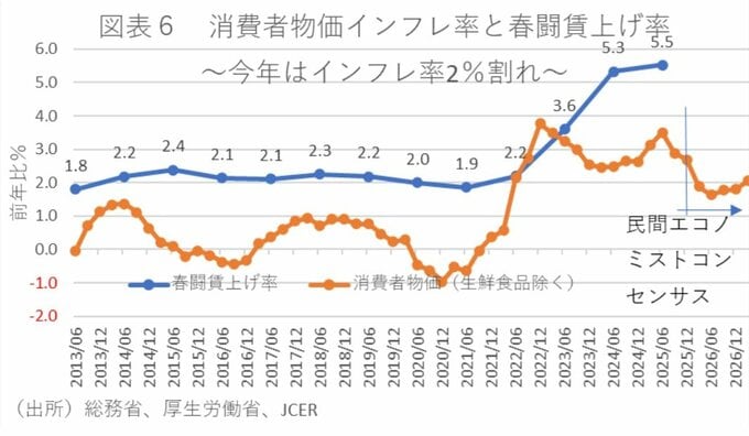 しかし2026年を展望すれば、昨年末からガソリン・軽油の暫定税率が廃止されていることや、電気・ガスの負担軽減策効果が2~4月分のCPIに発出することから、少なくとも春頃までは明確なインフレ率鈍化の可能性が高いだろう。