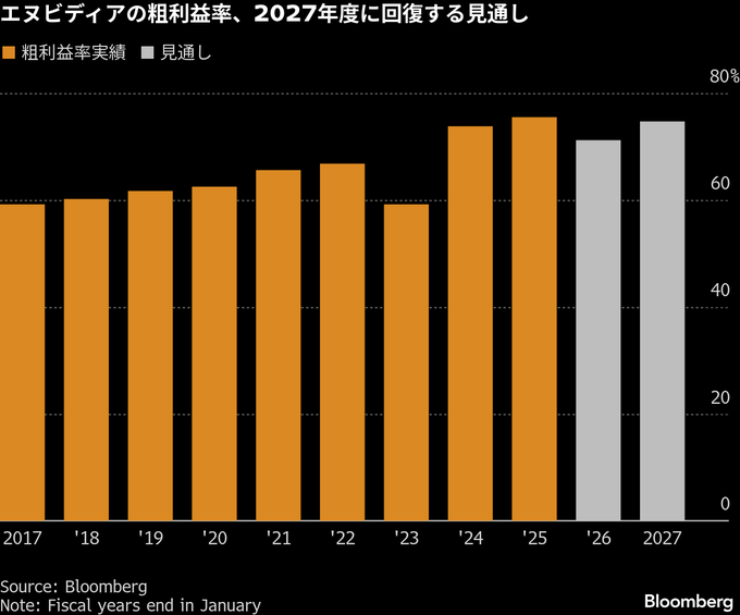 売上原価を除いた収益性を示す主要指標である粗利益率は、2024年度および25年度はいずれも70%台半ばだった。しかし、主力AIアクセラレーター「ブラックウェル」シリーズ半導体の量産立ち上げに伴うコスト増により、26年度(1月31日終了)には低下した。26年度の粗利益率は71.2%と予想されており、同社は27年度に再び約75%まで回復するとしている。利益率が想定を下回れば、ウォール街に警戒感が広がる可能性が高い。