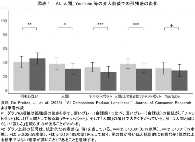 ハーバード・ビジネス・スクールなどの研究チームが2025年に発表した調査結果で、「AIや人間と会話した後、孤独感がどう変化したか」を測定したものを見ると、AIとの対話は、人間と話すのと同レベルで孤独を癒やす効果があるということが分かった。