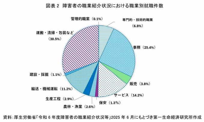 2023年度の障害者全体における「事務」職の割合は25.4%と、障害者雇用者全体の中で、「運搬・清掃・包装など」に次いで高い割合を示している。