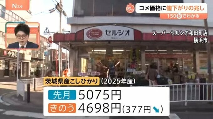 横浜市にある「スーパーセルシオ和田町店」の、茨城県産こしひかり(2025年産)の販売価格(5キロ)をみると、2025年12月は5075円だったのが、1月6日には4698円と、377円安く販売していました。