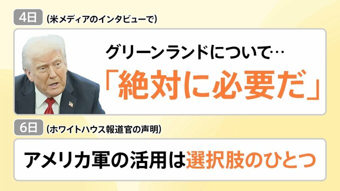 グリーンランドの領有については、これまでに何度も口にしてきていますが、1月6日にはホワイトハウス報道官が、その手段として「アメリカ軍の活用は選択肢のひとつ」と声明の中で強調しています。