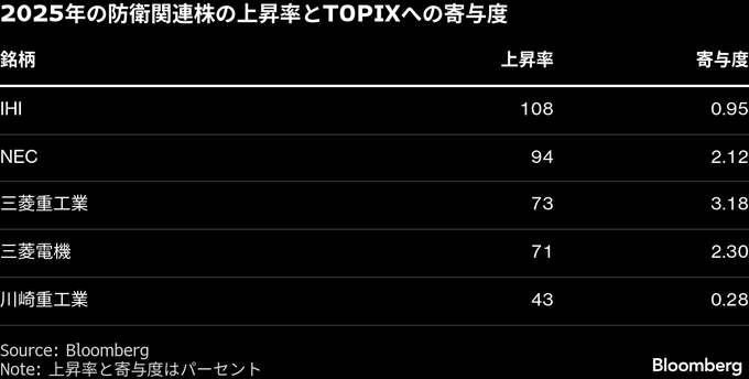 防衛関連株のさらなる上昇は、過去約35年で最高の好スタートを切った今年の日本株相場を一段と押し上げる要因となりそうだ。三菱重工やIHIのほか、NECなどの関連銘柄は、25年に東証株価指数(TOPIX)が22%高と米国株を上回るパフォーマンスを上げるのにも寄与した。