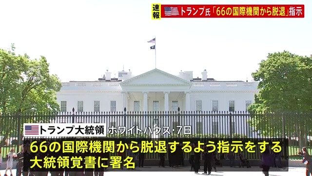 ホワイトハウスは7日、トランプ大統領が31の国連機関を含む66の国際機関から脱退するよう指示をする大統領覚書に署名したと発表しました。