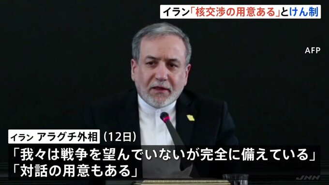一方、イランのアラグチ外相は「我々は戦争を望んでいないが、完全に備えている」としつつ、「対話の用意もある」と述べ、アメリカをけん制しました。また、中東アルジャジーラのインタビューに応じ、トランプ政権のウィットコフ中東担当特使と「現在も連絡を取っている」と明らかにしたうえで、「脅迫や命令がなければ、核交渉のテーブルに着く用意がある」と述べました。