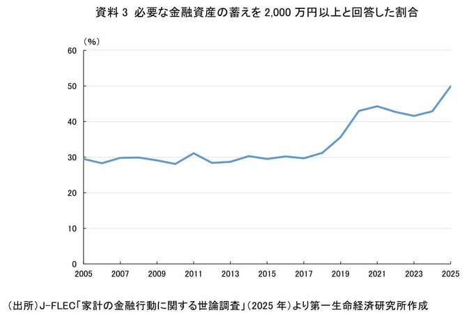実際に、金融経済教育推進機構(J-FLEC)の「家計の金融行動に関する世論調査」では、金融資産の目標残高を2,000万円以上とする割合が2018年:31.2%→2019年:35.6%→2020年:43.0%と急上昇、足元ではさらに上昇しており、2025年:49.9%に達している。