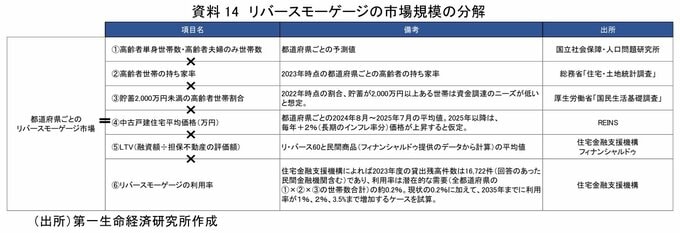 以上の項目の数値を掛け合わせ、都道府県ごとのリバースモーゲージの融資残高を算出し、足し合わせて日本のリバースモーゲージ市場の潜在的な市場規模を試算した。