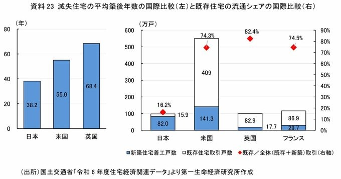 エリアによって利用可否に大きな差が生じる要因の一つは、日本の住宅事情にある。日本では、諸外国と比較して住宅が取り壊されるまでの年数が短い。