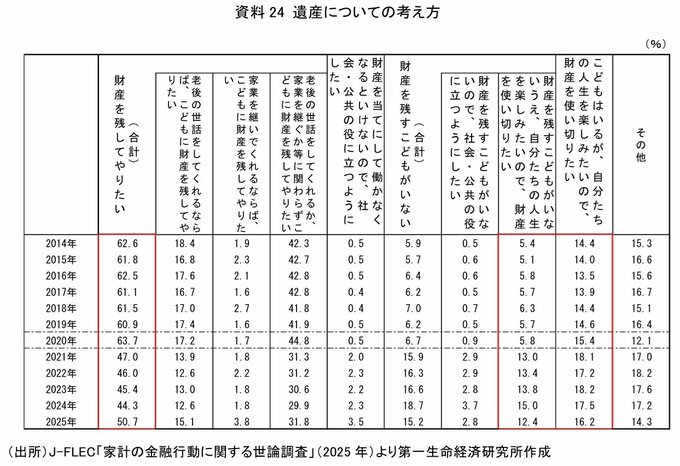 一方で、J-FLECの「家計の金融行動に関する世論調査」によると、「こどもに財産を残してやりたい」と考える人は、2025年調査で増加したものの、長期的には減少傾向にある。
