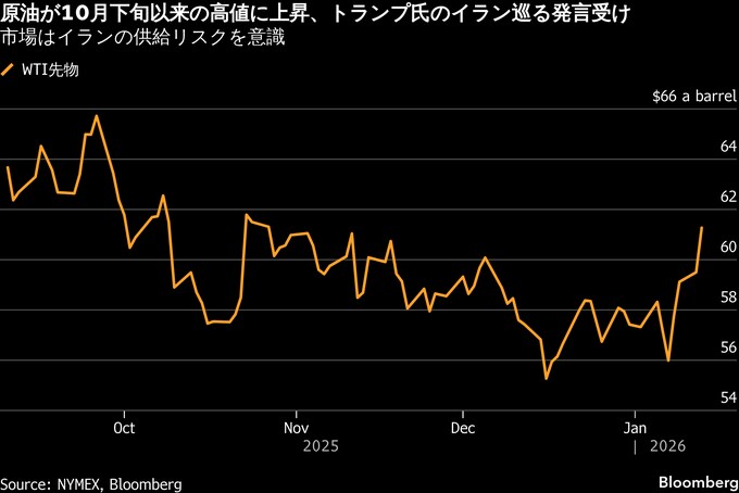 ウェスト・テキサス・インターミディエート(WTI)先物は1バレル=61ドル台で引け、約2カ月ぶりの高値。トランプ氏はデトロイトで記者団に対し、米国民がイランから退避するのは「良い考えだ」と発言。イランのデモ参加者に対して「支援が向かっている」とも述べた。