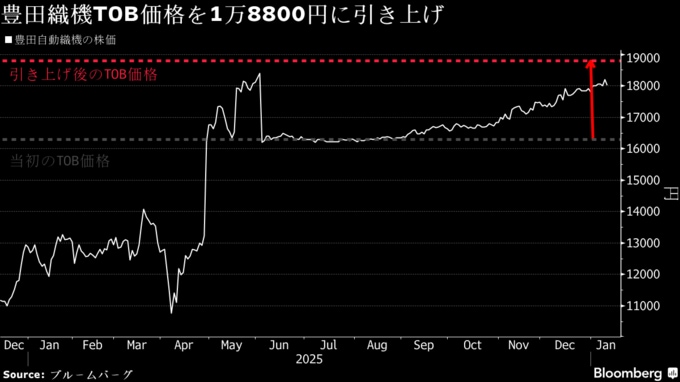 (ブルームバーグ):トヨタ自動車グループが豊田自動織機に対する株式公開買い付け(TOB)価格を1万8800円に引き上げると発表した。従来から15%程度の増額となる。TOBを巡っては価格の低さに株主から批判も出ており、今回の引き上げで決着するかは不透明だ